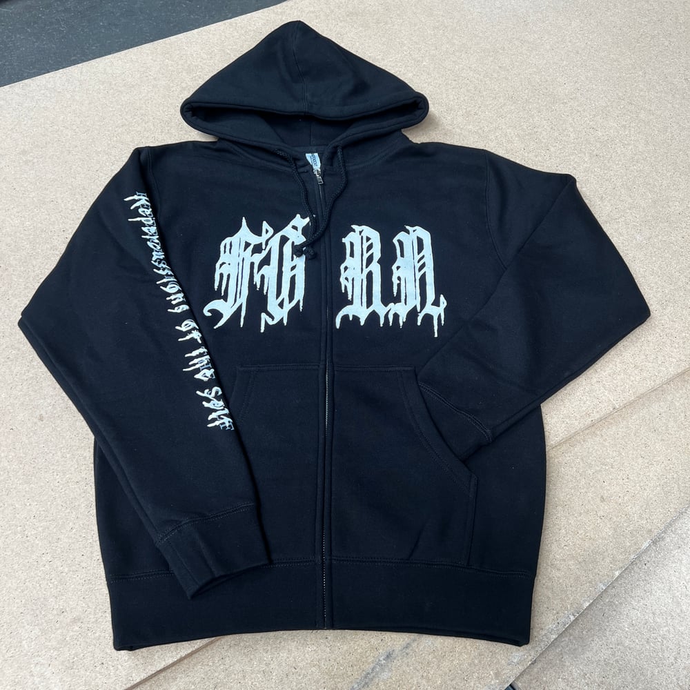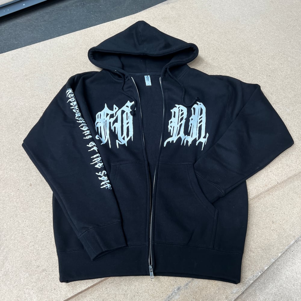 White ink on front, back and one sleeve print - same design as our tour L/S. Printed on high quality Independent Trading Company IND4000 10oz. Heavyweight Zip Hood blanks, hand screened in Los Angeles by Mean Street Press.